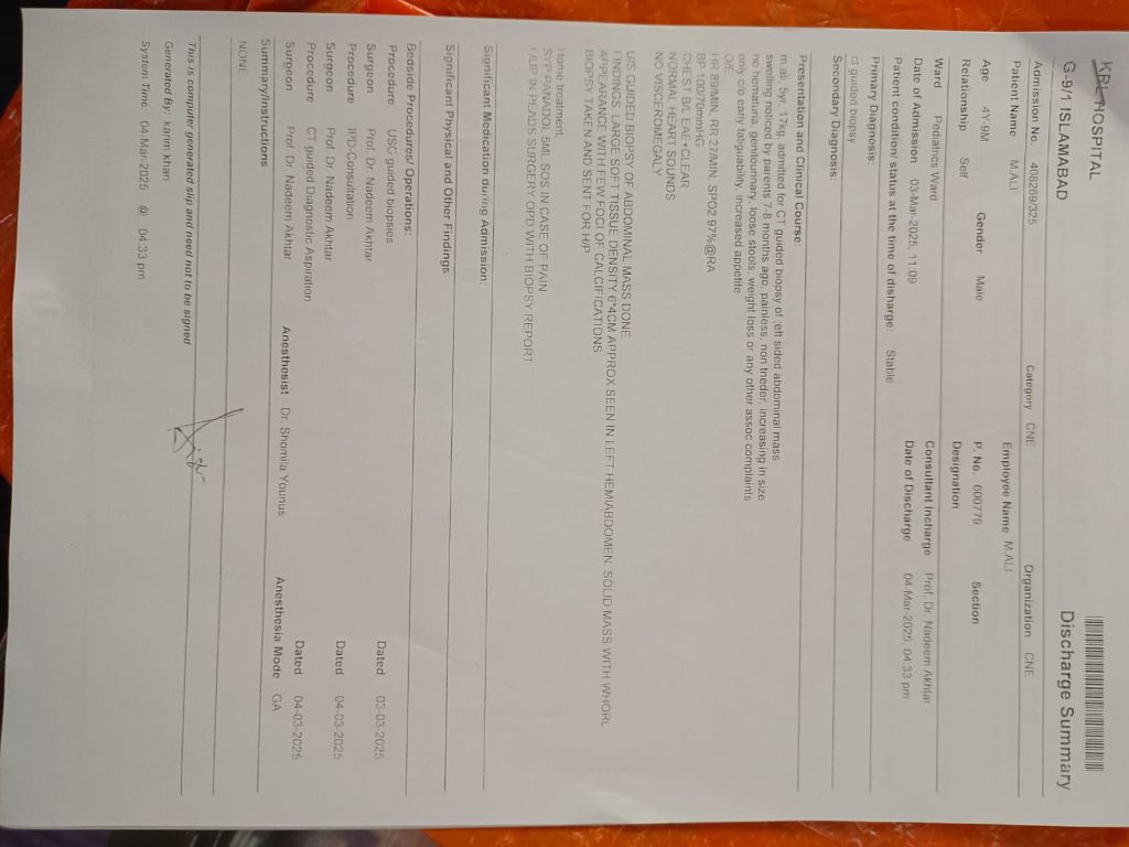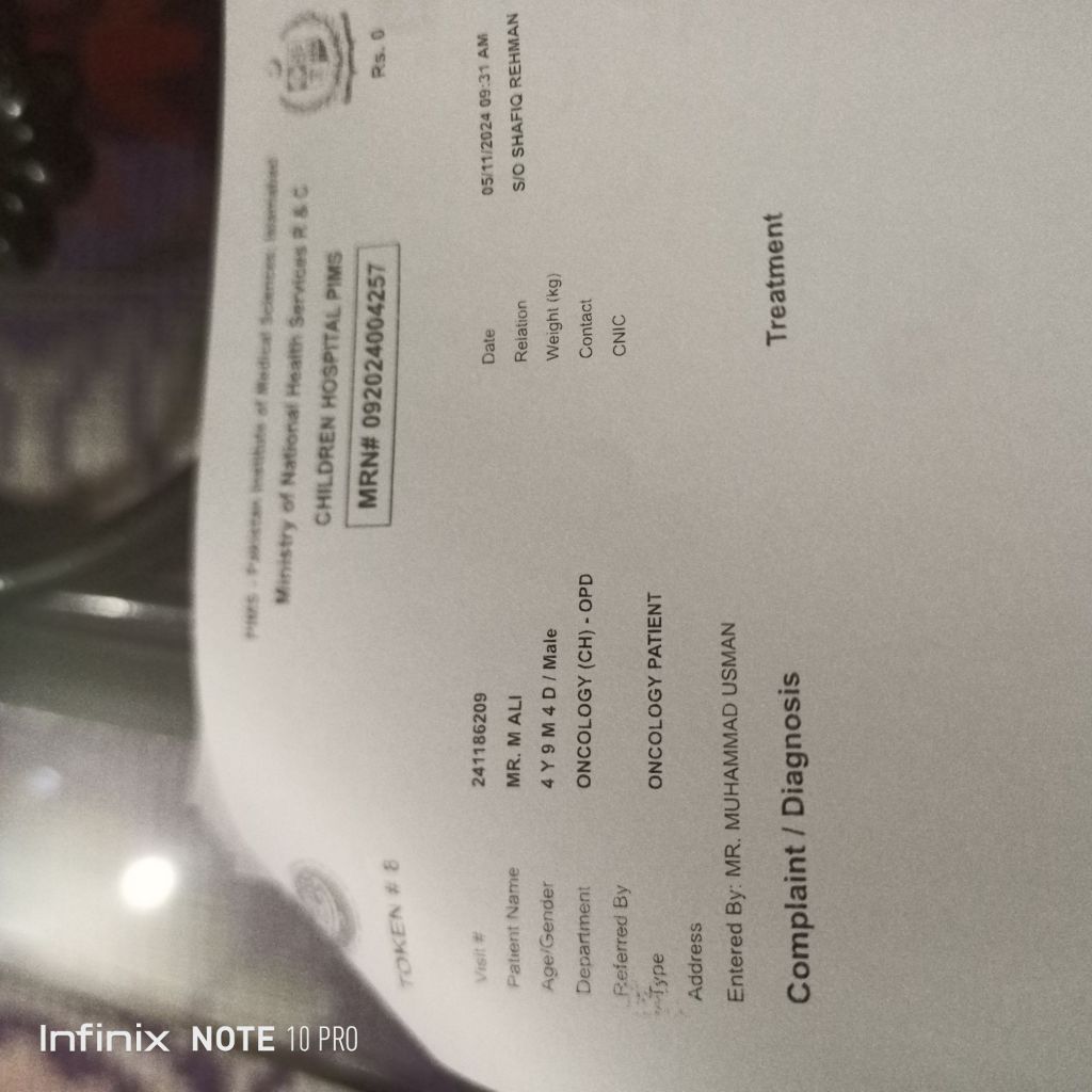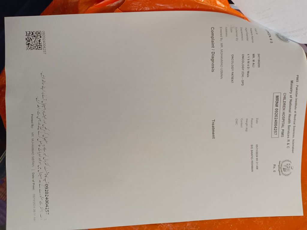 I am writing to request urgent humanitarian support for a very poor family in Pakistan whose young child age 4 years and months is suffering from cancer. The family has no financial resources left, and the child’s treatment is at risk.